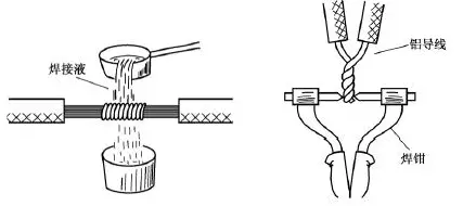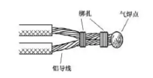 氣焊是指利用氣焊槍的高溫火焰,將鋁芯線的連接點加熱,使待連接的鋁芯線相互熔融連接。氣焊前應將待連接的鋁芯線絞合,或用鋁絲或鐵絲綁扎固定,如圖19所示。