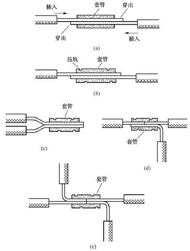 橢圓截面套管使用時,將需要連接的兩根導線的芯線分別從左右兩端相對插入并穿出套管少許,如圖14(a)所示,然后壓緊套管即可,如圖14(b)所示。橢圓截面套管不僅可用于導線的直線壓接,而且可用于同一方向導線的壓接,如圖14(c)所示;還可用于導線的T字分支壓接或十字分支壓接,如圖14(d)和圖14(e)所示。